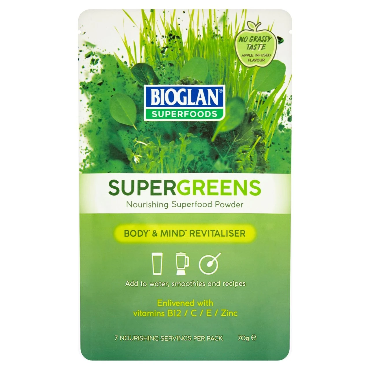 Our unique and nourishing Super greens blend is bursting with powerful Super foods, including wheatgrass, spirulina, barley grass, kale and chlorella. It’s also fortified with vitamin B12, C and E, all packed into a convenient powder so it’s easy for you to use in everyday foods or even just mix with water. Super greens’ great flavor comes from apple powder and subtle spices, so now it’s even easier to eat your greens.