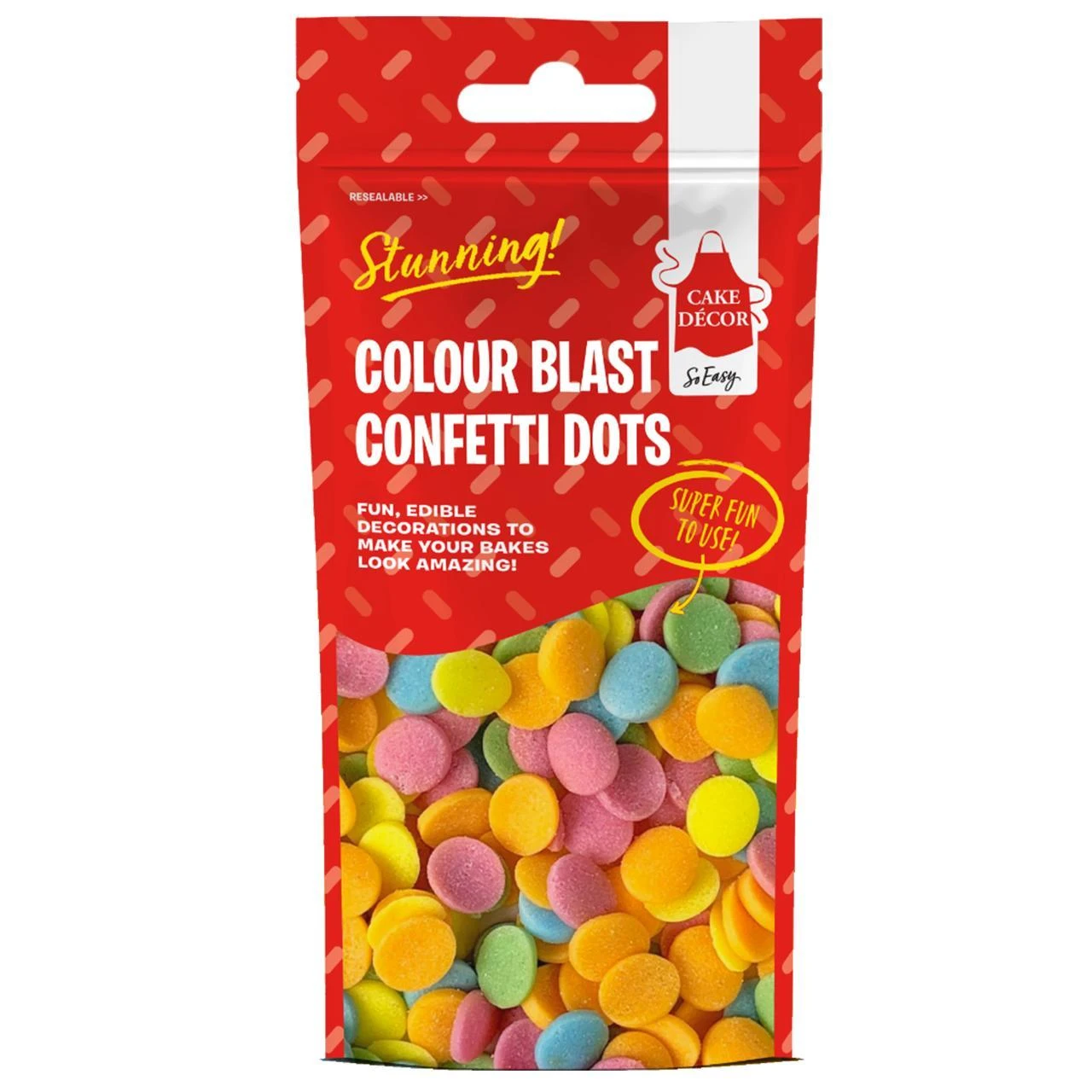 Multi-colored sugar decorations. Free flowing disc shaped sugar decorations colored pink, orange, yellow, blue and green with a vanilla flavor.