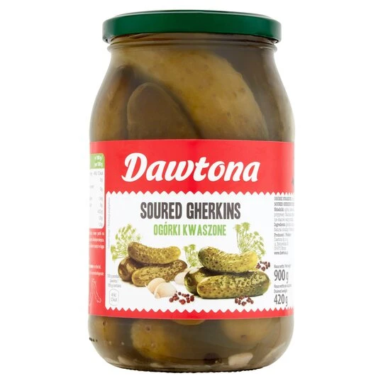 Soured Gherkins in Brine. Natural clouding of brine is not a product defect. Pasteurized product.