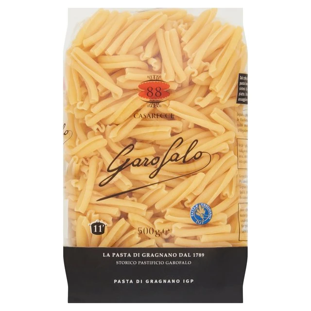 Garofalo has been making pasta for over 300 years in Gragnano near Naples in Italy, the home of pasta. Made from 100% robust desert durum wheat and shaped using a bronze die gives Garofalo pasta its premium taste and texture. Casarecce originates from Sicily, but is also typical of central southern Italy. Casarecce pasta is shaped like a very narrow, twisted and rolled tube, and whose name means `homemade’, and is best served with a chunky sauce. European Vegetarian Union, Vegan, Kosher