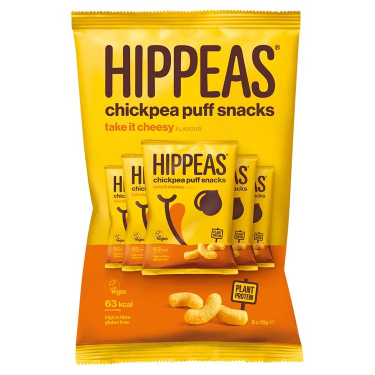 Chickpea based puffs with vegan cheese flavor. Multipack contains 5 x 15g bags. Packed with Plant protein. Nothing artificial. A source of fiber and protein. 91 calories or less per serving. Gluten and palm oil free. No MSG. Suitable for vegans. Suitable for Vegetarians.