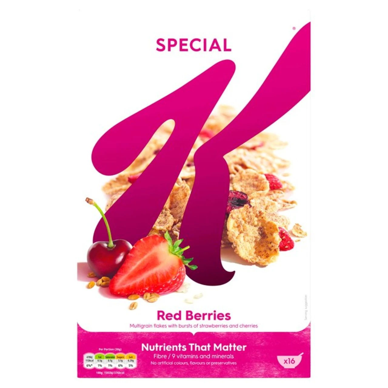 A serving of Special K cereal contains ≥15% RI of iron and vitamin B6 which contribute to the reduction of tiredness and fatigue, vitamin D which contributes to the normal function of the immune system and vitamin B12 which contributes to normal energy-yielding metabolism. The power of multigrain Special K is made with three grains: rice, wholewheat and barley. Rolled, flaked & toasted. No artificial colours, flavours or preservatives. Multigrain flakes with bursts of strawberries and cherries, Fibre / 9 vitamins and minerals, No artificial colours, flavours or preservatives, Suitable for vegetarians, Halal – HFA Approved, Kosher