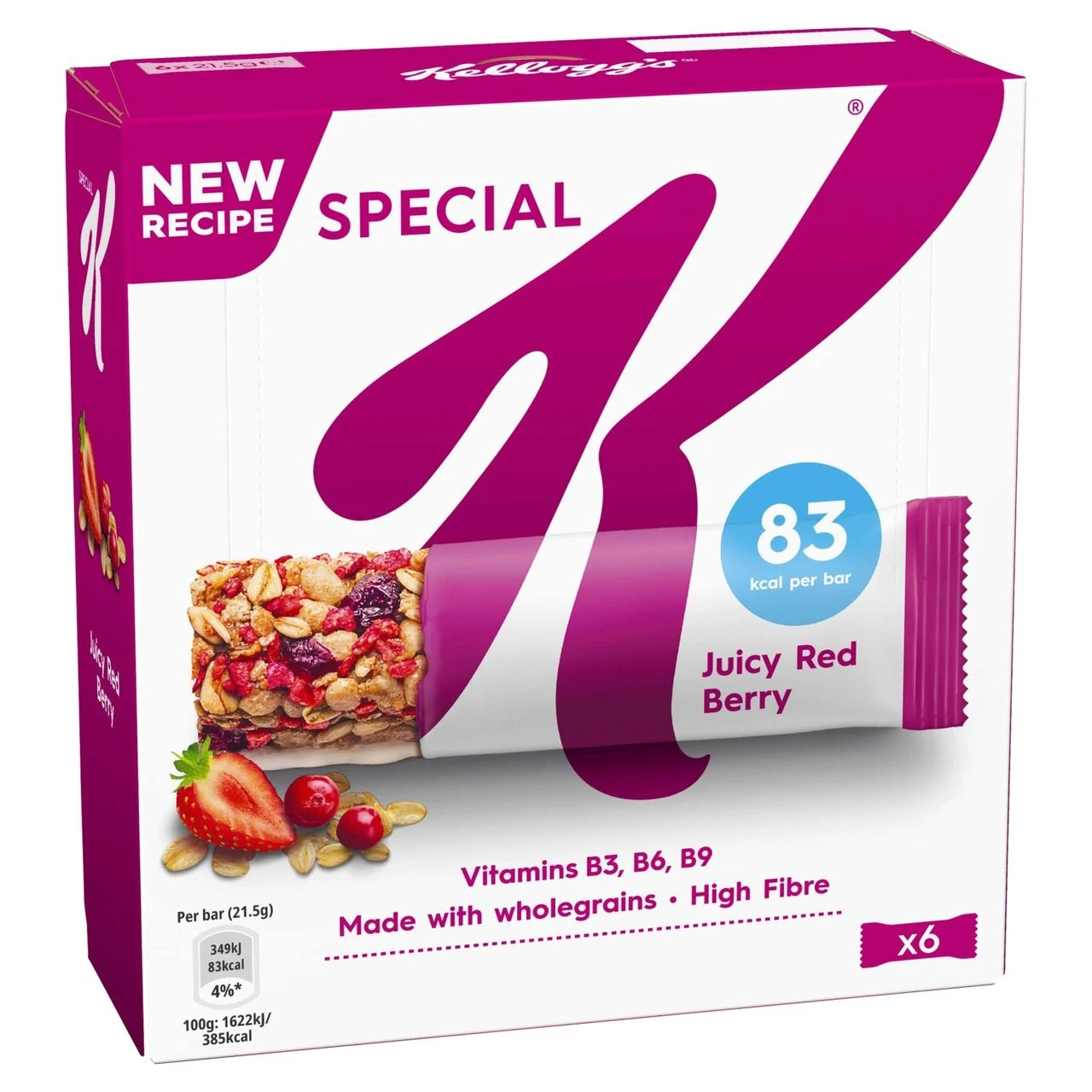Special K bars are a source of vitamin B3 which contributes to normal energy-yielding metabolism, vitamin B6 which contributes to the reduction of tiredness and fatigue and vitamin B9 which contributes to the normal function of the immune system. 83kcal per bar, Vitamins B3, B6, B9, Made with whole grains, High fiber, 41% Wholegrain, No artificial flavors, colors, preservatives or sweeteners, Suitable for Vegetarians, Halal – HFA Approved.