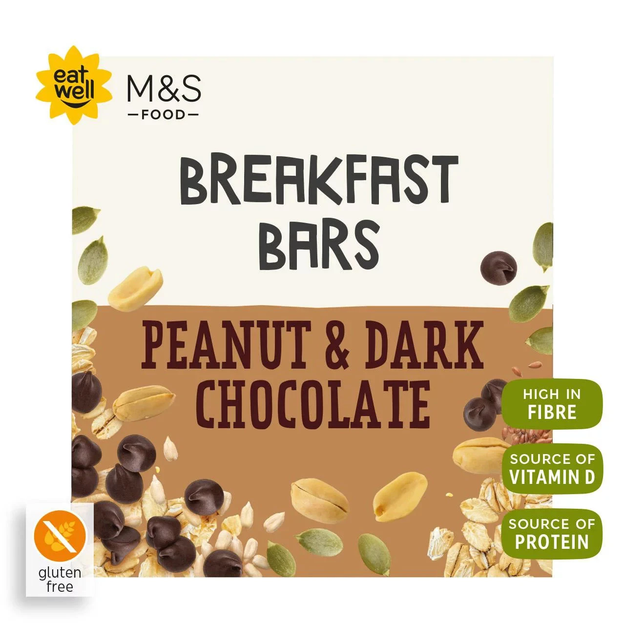 Deliciously chewy bars packed with oats, seeds, dark chocolate chips and peanut butter. High in fibre. Source of vitamin D. Source of protein. Gluten free. Four per pack.