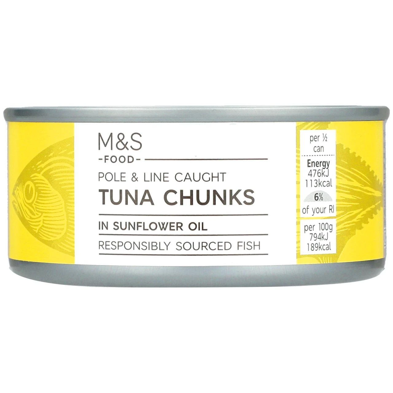 Soaked in sunflower oil, these flaky tuna chunks can be added to pasta salad or jacket potatoes for a tasty meal. 160g net weight, 120g drained weight. Our M&S seafood products have been sourced from fisheries and fish farms in a way that minimizes their ethical and environment impact, while guaranteeing you the highest quality, delicious seafood you’d expect from M&S.