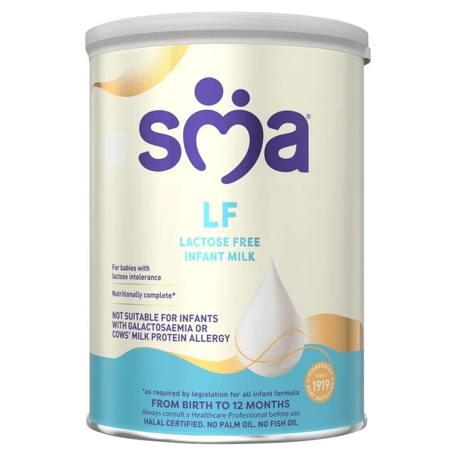 Enriched with Omega 3 DHA. SMA LF® is a lactose-free infant milk for babies who are lactose intolerance, or who are experiencing symptoms such as diarrhoea, tummy ache or wind caused by temporary lactose intolerance. SMA® LF Lactose Free Infant Milk is nutritionally complete and suitable as the sole source of nutrition for infants from birth. For older babies, it can be used as part of a mixed diet. It is suitable for up to 18 months of age and may be used for older children and adults with lactose intolerance as part of a lactose free diet. Nutritionally complete lactose free infant milk, Suitable from birth, Contains fish oil as a source of Omega 3, Lactose Free (not suitable for infants with galactosaemia)