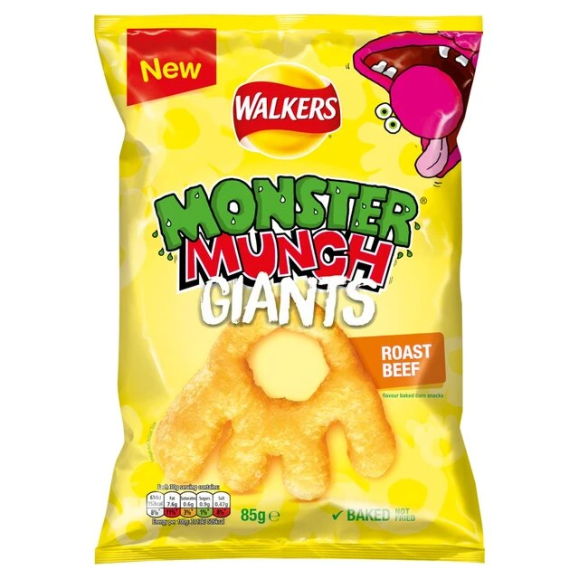 Deliciously meaty Walkers Monster Munch Roast Beef flavor snacks. Sharing bag perfect for break time, lunch time or party time. Crunchy, tasty and totally spooky, Monster Munch are a family favorite. Baked not fried and contain no artificial colors. Suitable for Vegetarians.
